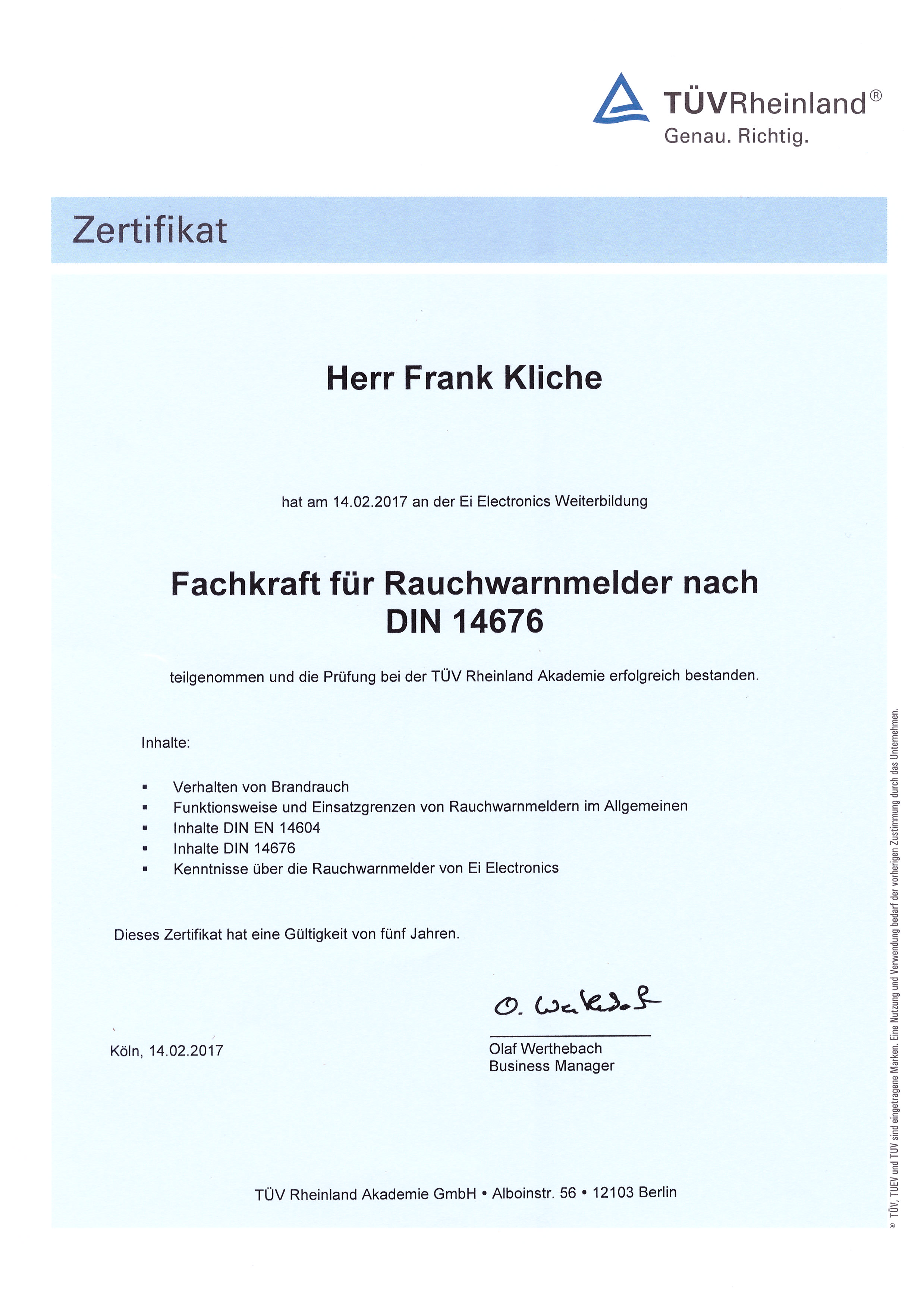 TÜV Zertifizierte Fachkraft für Rauchwarnmelder.
